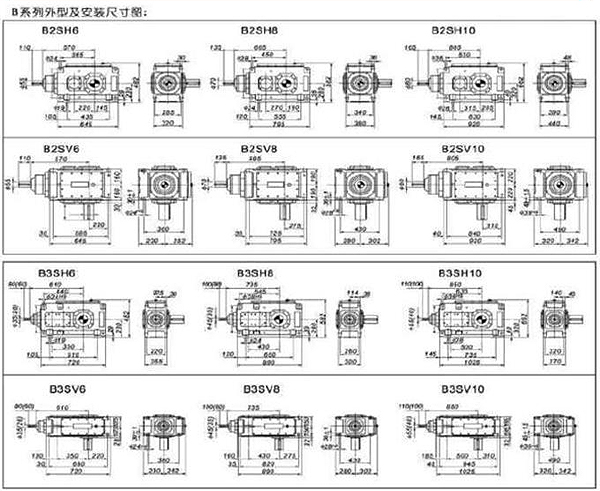 7.H、B系列產(chǎn)品有3~26型規(guī)格,減速傳動(dòng)級數(shù)有1~4級,速 比1.25~450;和我廠R、K、S系列組合得到更大的速比。