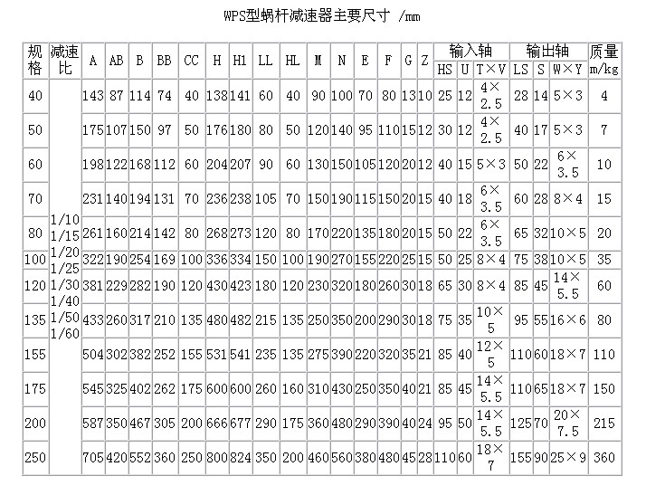 WPS40、WPS50、WPS60、WPS70、WPS80、WPS100、WPS120、WPS135、WPS155、WPS175、WPS200、WPS250型蝸輪蝸桿減速器